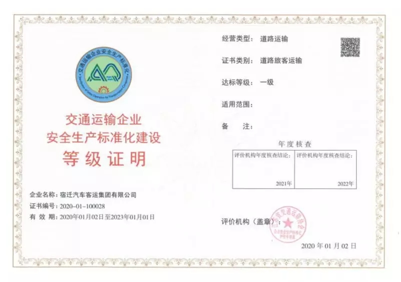 通過(guò)江蘇省交通運(yùn)輸協(xié)會(huì)企業(yè)安全生產(chǎn)標(biāo)準(zhǔn)化評(píng)價(jià)組的審核、考評(píng)、評(píng)定、公示,日前,宿汽集團(tuán)順利拿到了交通運(yùn)輸企業(yè)安全生產(chǎn)標(biāo)準(zhǔn)化建設(shè)一級(jí)證書(shū)。