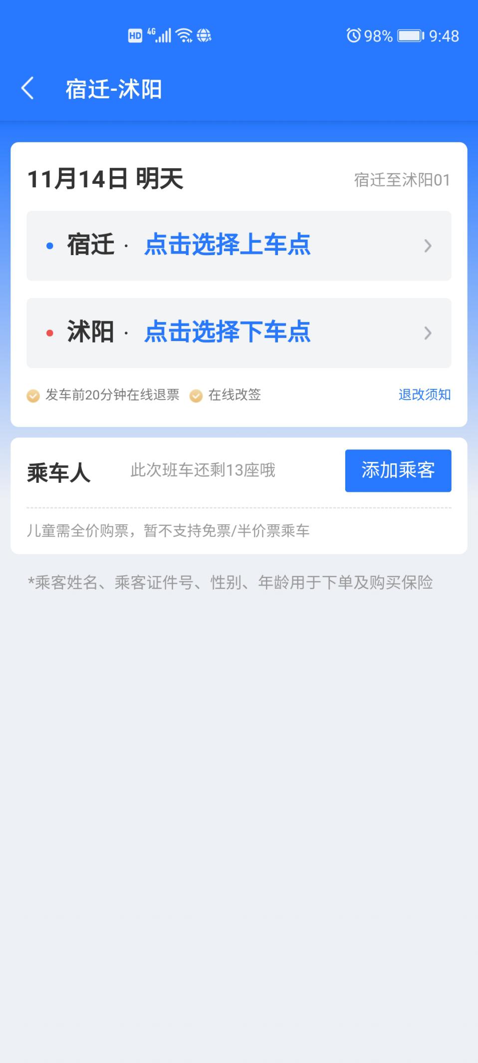 步驟四:選擇上車、下車站點,填寫乘車人信息;