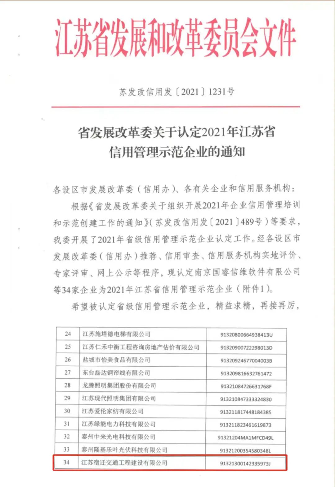 近日,江蘇省發(fā)展改革委公布了“2021年江蘇省信用管理示范企業(yè)名單”,其中,宿遷交建成功入選,同時也是宿遷地區(qū)唯一一家入選的企業(yè)。