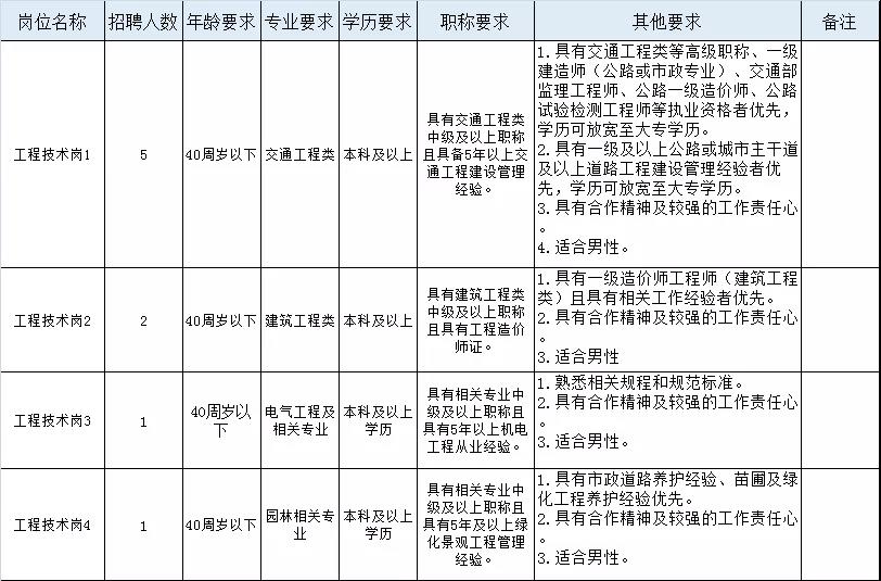 具有一級(jí)建造師或高級(jí)工程師,且市政或交通工程管理經(jīng)驗(yàn)豐富的特殊人才,聘用形式及薪酬待遇可一事一議。