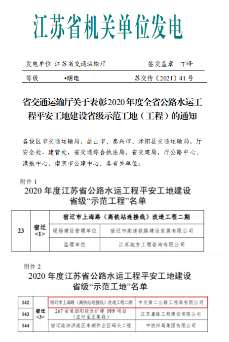 近日,江蘇省交通運輸廳公布了2020年度全省公路水運工程平安工地建設省級“示范工地(工程)”名單,由高鐵公司承建的上海路(高鐵站連接線)改造工程二期光榮上榜。至此,市綜合客運樞紐工程、市高鐵商務區(qū)市政配套工程等該公司所有承建項目均獲得平安工地“示范工地”稱號。