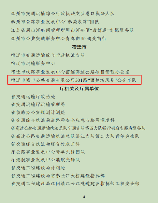 近日,省交通運輸行業(yè)黨委發(fā)布《關(guān)于表揚全省交通運輸行業(yè)青年建功標兵團隊和青年建功標兵個人的通報》,公交公司301路“西楚清風號”公交車隊榮獲“全省交通運輸行業(yè)青年建功標兵團隊”稱號。