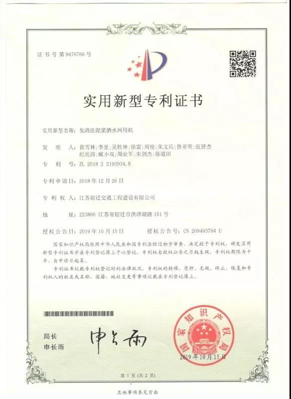 近日,宿遷交建又喜獲一項(xiàng)發(fā)明專利——“免清洗泥漿灑水兩用機(jī)”獲得國家知識產(chǎn)權(quán)局授權(quán),并取得專利證書。