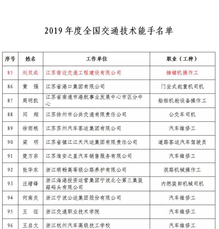 近日,由國(guó)家交通運(yùn)輸部組織開展的2019年度全國(guó)交通技術(shù)能手評(píng)選結(jié)果出爐,宿遷交建劉雙成被授予2019年度“全國(guó)交通技術(shù)能手”稱號(hào),也是宿遷市唯一獲此殊榮的選手。