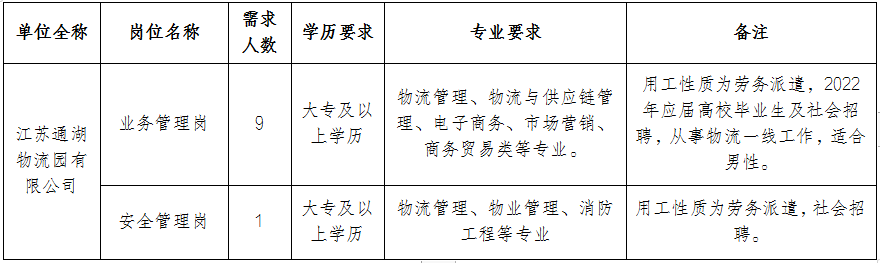 根據(jù)生產(chǎn)經(jīng)營工作需要,江蘇通湖物流園有限公司擬招聘一批勞務(wù)派遣制人員?,F(xiàn)將招聘人員方案如下: